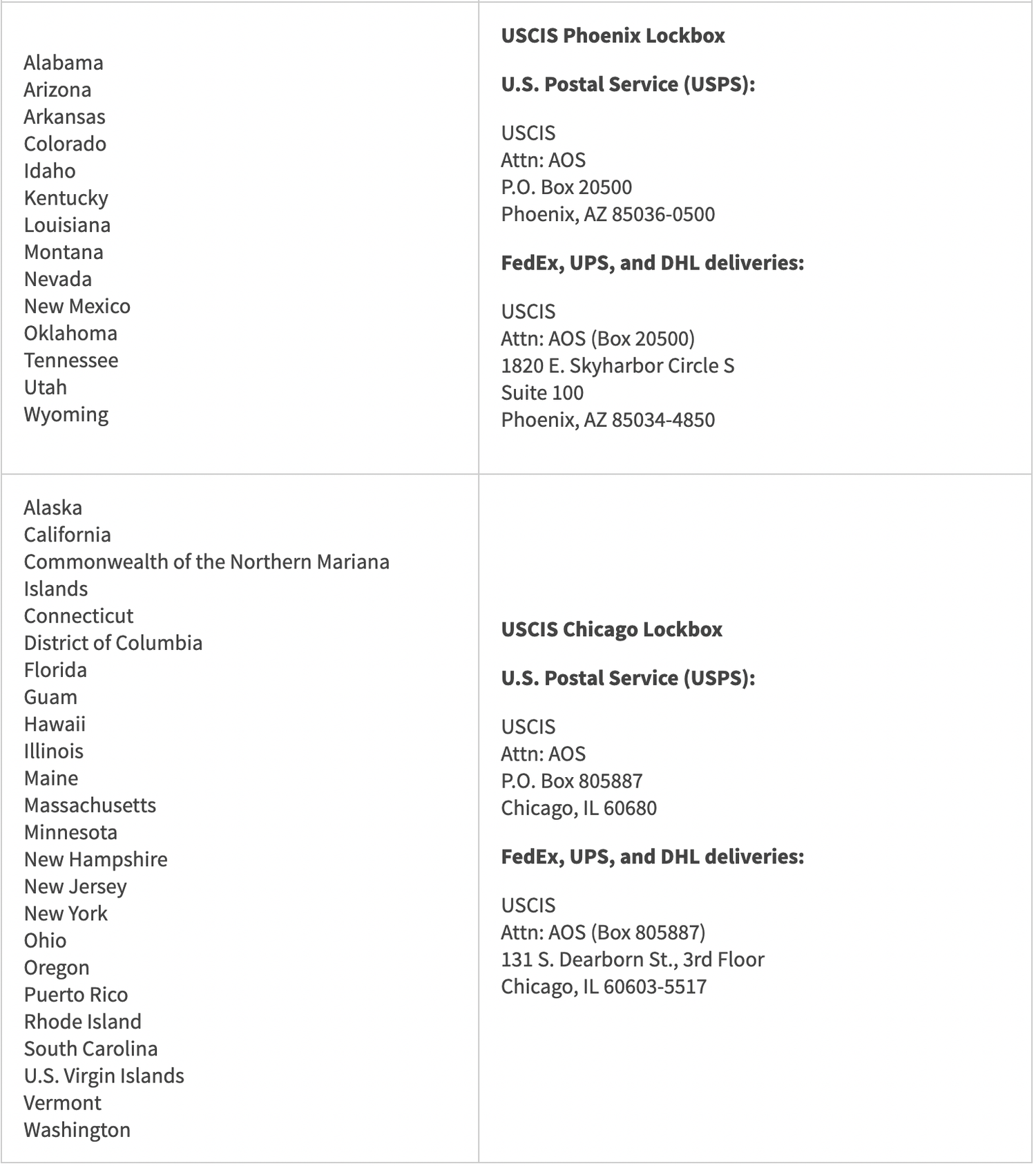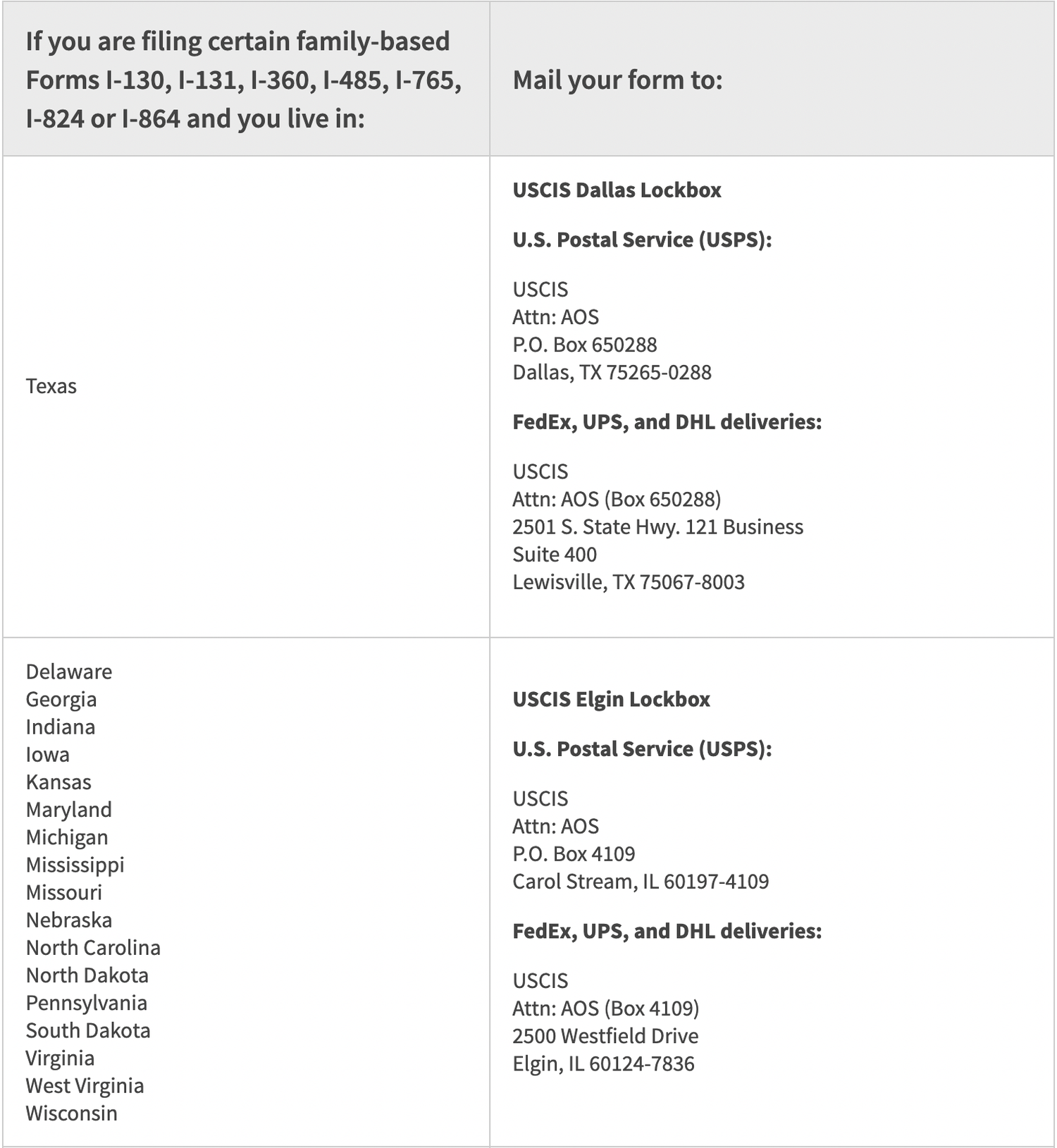 提交表格请注意邮寄地址。USCIS根据申请人所在的不同管辖区和邮寄方式分别有不同的邮寄地址。